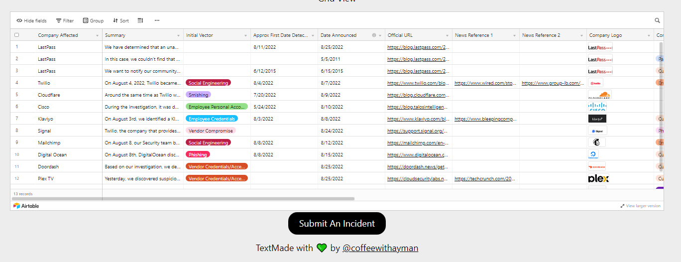 Looking at so many incidents, I ended up putting together an Airtable with some attributes of various incidents and then linked them together to certain campaigns. I threw it up on a domain I had, Foorbarsec.com, which seems pretty appropriate. Lmk if you’re interested in helping.