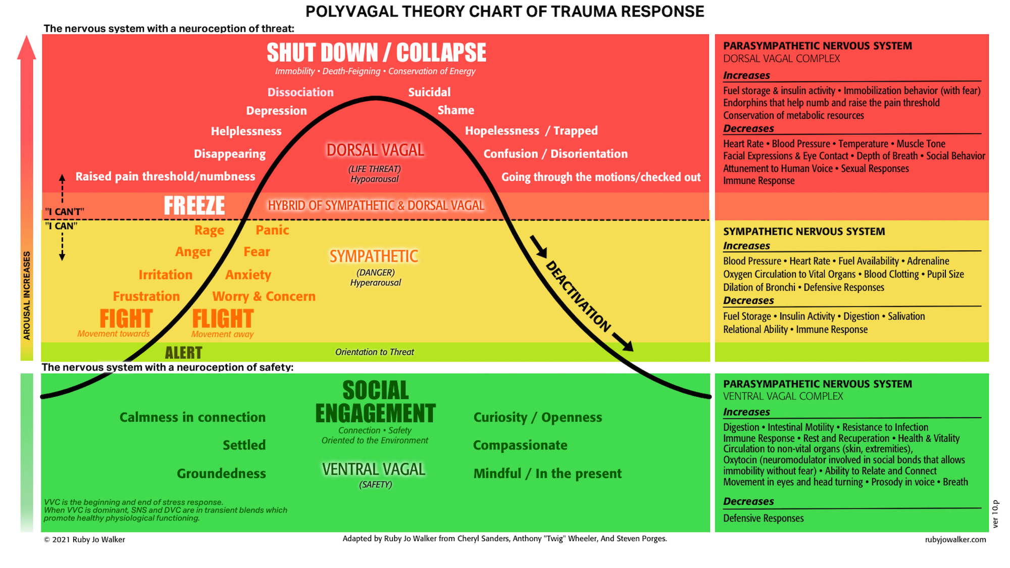 In Polyvagal Theory, the sympathetic nervous system otherwise known as the “Fight or Flight” mechanism will subvert any sense of safety experienced in the body. This includes key words such as: