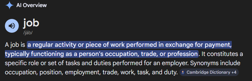 Or in other words, a job is a collection of activities, tasks, that are are performed in exchange for payment.